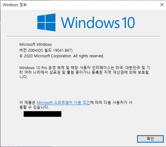 그리고 WSL2로 업그레이드를 하는데, 버전 1903 이상, 빌드 18362 이상을 요구한다고 한다. 지금쯤 되면 다 그 이상은 될것 같으니 굳이 확인 안해도 되겠지. 혹시 몰라 winver를 확인해보면....